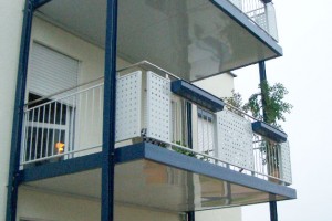 Aluminiumbalkone mit Balkonbetonplatten, Entwässerung sowie Geländer mit Lochblechfüllung