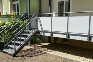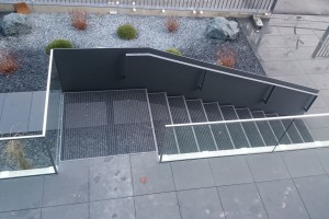 Eingangsterrasse mit Treppe, Belag mit feinmaschigen Gitterroste, Geländer farblich beschichtet
