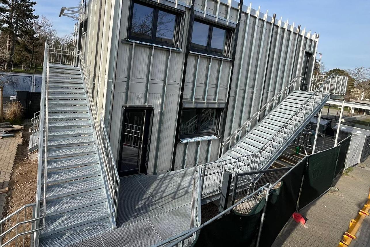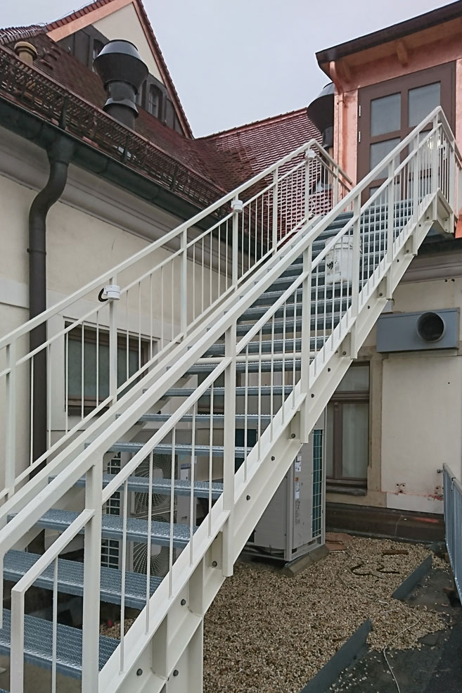 Treppenanlage mit Zwischenpodest, Gitterroststufen, Geländer mit aufgesetztem Edelstahlstahlhandlauf